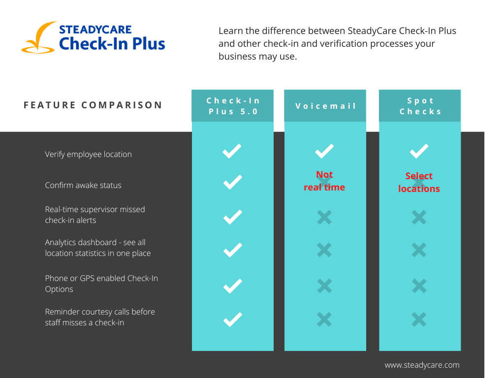 Check out this comparison chart to see how SteadyCare stacks up against traditional check-in monitoring options. With a range of